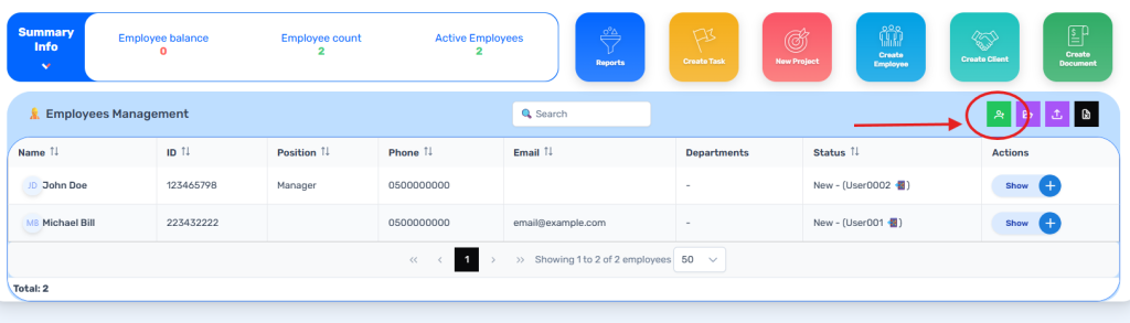 • The new employee will now appear in the Employees Management table, where you can view and manage their details.